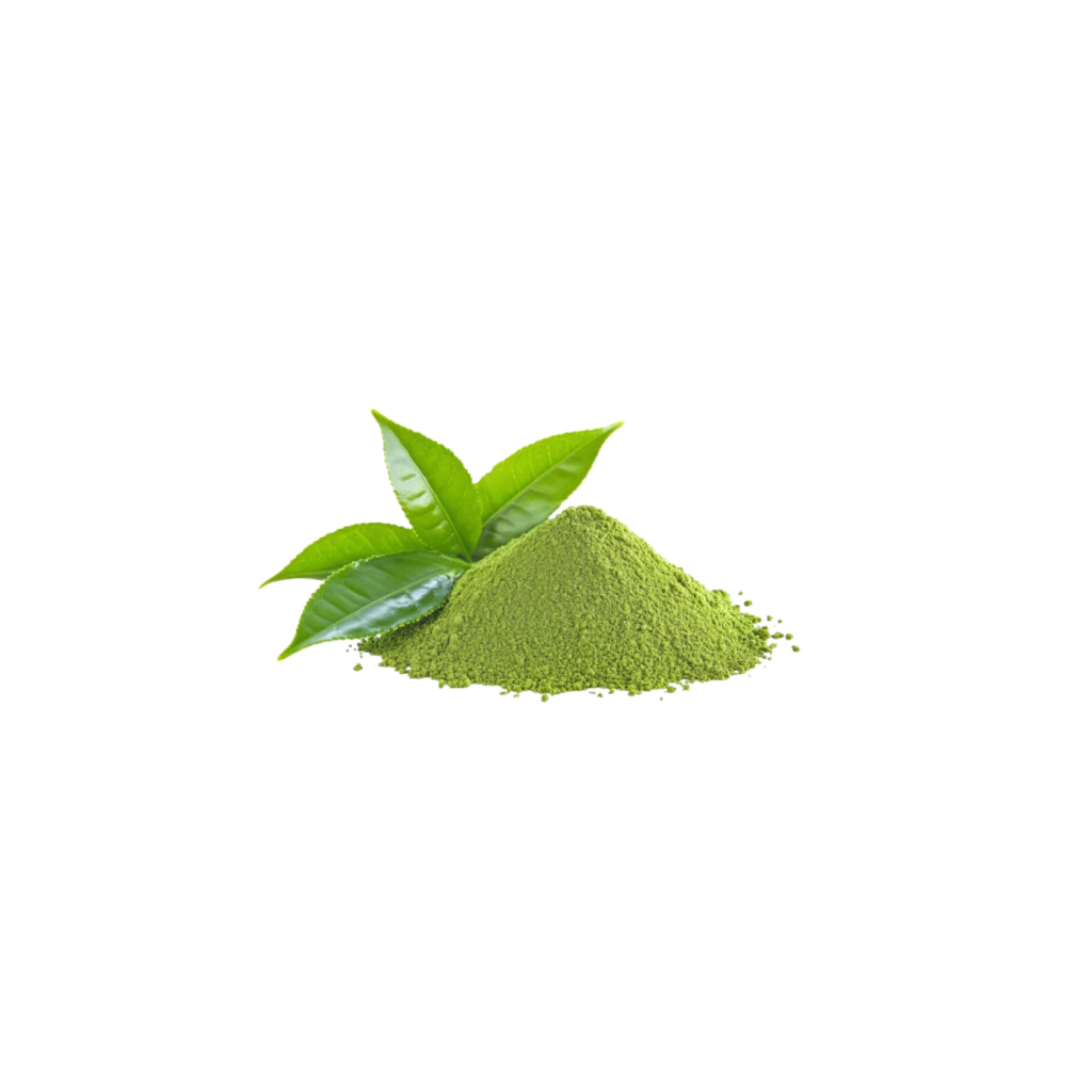 O chá verde em pó é produzido a partir das folhas da Camellia sinensis, moídas finamente para preservar seus nutrientes e facilitar o preparo. Possui sabor levemente amargo e adstringente, característico da planta.